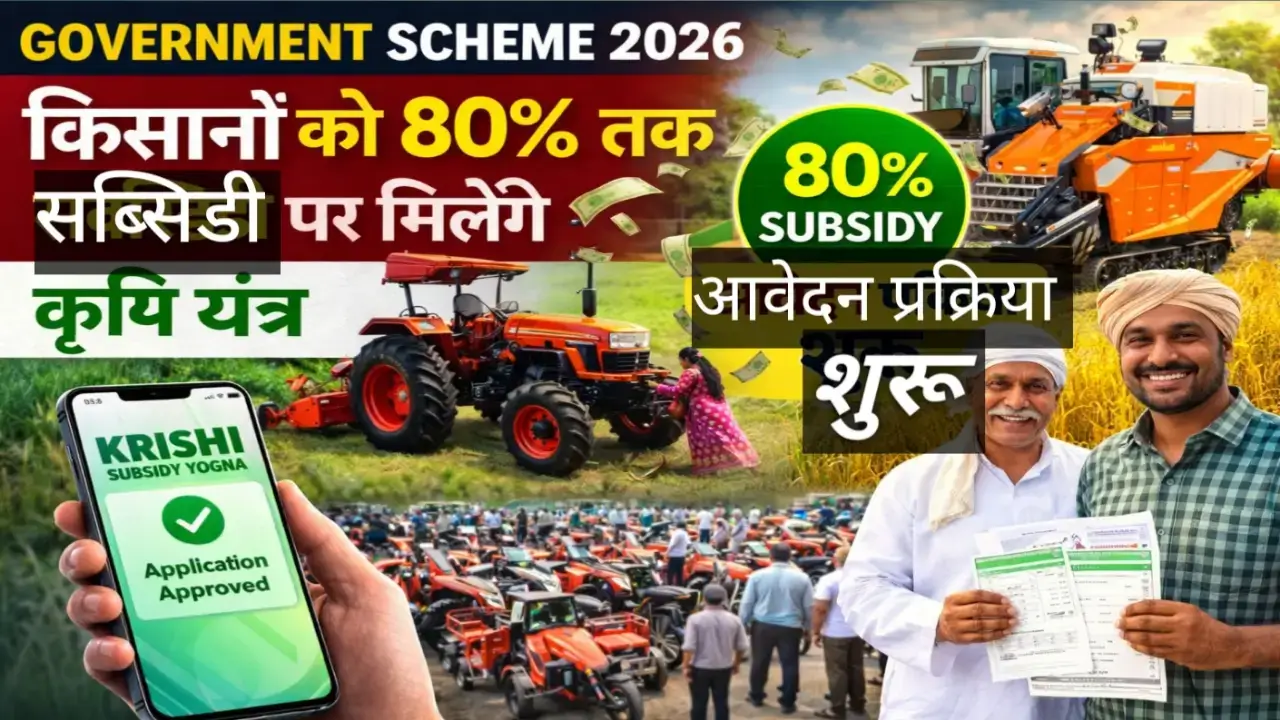Government Scheme 2026: किसानों के लिए सरकार की ओर से एक बड़ी राहत भरी खबर सामने आई है। खेती को आसान और आधुनिक बनाने के लिए, सरकार अब कृषि यंत्रों पर 80% तक सब्सिडी दे रही है।इस योजना के तहत किसान, ट्रैक्टर, सीड्रिल, रोटावेटर व अन्य खेती के उपकरण कम कीमत पर खरीद सकेंगे।योजना के लिए आवेदन प्रक्रिया भी शुरू हो चुकी है, जिससे देशभर के किसान इसका लाभ लेकर अपनी खेती को अधिक लाभदायक बना सकते हैं।